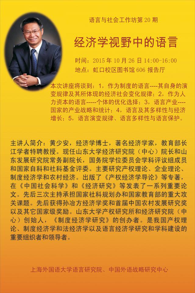 讲座内容:1、作为制度的语言----其自身的演变规律及其所体现的经济社会变化规律;2、作为人力资本的语言-----个体的优化选择;3、语言产业----国家的产业战略和统计;4、语言及其多样性与经济增长;5、语言演变规律、语言多样性与语言保护。