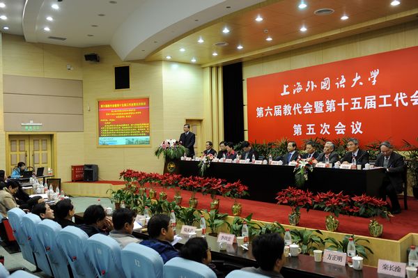 上海外国语大学第六届教代会暨第十五届工代会第五次会议于2011年3月21日下午举行第二次全体会议。校党政工领导吴友富、曹德明、谭晶华、李月松、王静、盛裕良,校党委常委庄智象以及校工会常务副主席王祥兴、校工会副主席陆经生、刘振新在主席台上就坐。大会由校党委副书记、校工会主席李月松主持。
