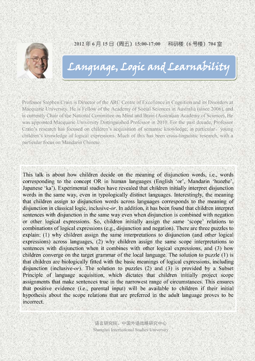 This talk is about how children decide on the meaning of disjunction words, i.e., words corresponding to the concept OR in human languages (English ‘or’, Mandarin ‘huozhe’, Japanese ‘ka’). Experimental studies have revealed that children initially interpret disjunction words in the same way, even in typologically distinct languages. Interestingly, the meaning that children assign to disjunction words across languages corresponds to the meaning of disjunction in classical logic, inclusive-or. In addition, it has been found that children interpret sentences with disjunction in the same way even when disjunction is combined with negation or other logical expressions. So, children initially assign the same ‘scope’ relations to combinations of logical expressions (e.g., disjunction and negation). There are three puzzles to explain: (1) why children assign the same interpretations to disjunction (and other logical expressions) across languages, (2) why children assign the same scope interpretations to sentences with disjunction when it combines with other logical expressions, and (3) how children converge on the target grammar of the local language. The solution to puzzle (1) is that children are biologically fitted with the basic meanings of logical expressions, including disjunction (inclusive-or). The solution to puzzles (2) and (3) is provided by a Subset Principle of language acquisition, which dictates that children initially project scope assignments that make sentences true in the narrowest range of circumstances. This ensures that positive evidence (i.e., parental input) will be available to children if their initial hypothesis about the scope relations that are preferred in the adult language proves to be incorrect.