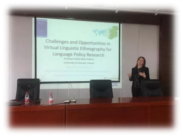 2017年11月14日,Language Policy 主编、爱尔兰利默里克大学教授Helen Kelly Holmes在上海外国语大学做了题为“语言政策研究中虚拟民族志面临的挑战和机遇”的讲座。