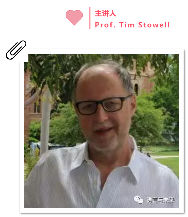 ◆ ◆ ◆ ◆ ◆ 上外研究生学术训练营(语言学类) Tense vs. Tenselessness in English and Chinese ◆ ◆ ◆ ◆ ◆ 主讲:Tim Stowell教授 时间:11月21日(星期三)14:30-16:30 地点:上海外国语大学虹口校区图书馆6楼606室 讲座语言:英语 主持人:花东帆副教授 主办单位:上海外国语大学语言研究院、中国外语战略研究中心、研究生院