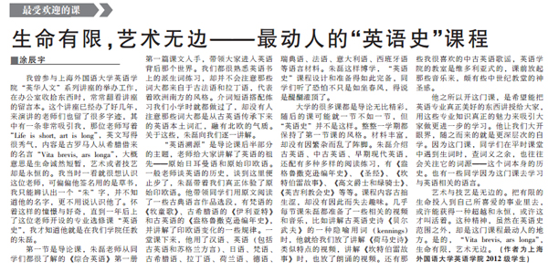 2015年3月5日,《文汇报》教育版报道了我院朱磊老师及其“英语史”课程,全文如下: